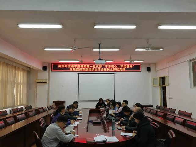 按照学院党委《“不忘初心、牢记使命”主题教育实施方案》安排,12月4日下午,商贸学院教师第一党支部在五楼会议室召开“不忘初心、牢记使命”主题教育专题组织生活会及民主评议党员。会议由党支部书记晋淑惠主持,商贸学院教师第一党支部全体党员参加了会议。
