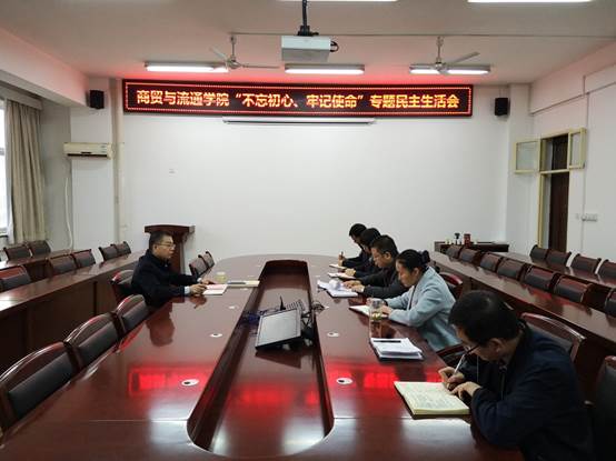 12月6日下午,商贸与流通学院党总支在崇文南楼A501开展“不忘初心、牢记使命”专题民主生活会。学院党委书记惠朝阳同志参会并指导,商贸学院领导班子成员及党总支委员参加会议,会议由党总支书记陈昊平主持。