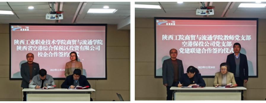 一行人首先在企业领导陪同下,参观了空港综合保税区沙盘区,并听取详细介绍,了解了空港综合保税区的核心位置与经济发展的战略定位。随后,张磊总经理对陕西省空港综合保税区投资有限公司的基本情况进行了详细说明,并表示,空港保投公司作为西咸新区空港新城管委会下属的大型国有独资企业,在临空、自贸、保税、口岸、跨境、航权等方面具有独特的优势,与陕西工业职业技术学院开展党建联建,能够有效增强党组织组织力、凝聚力、战斗力,对深化校企合作,加快实现校企党建工作优势互补、良性互动,开创校企党建工作合作新格局都能够起到极大的促进作用。蒋鹏书记介绍了商贸与流通学院的发展现状,并指出,开展校企党建联建活动,不仅能够促进党建工作经验的交流,同时,企业党员与教师党员的深入交流能够更好地推进专业建设,并在人才培养、实训室建设、就业创业、社会服务、企业技术骨干培养等多个方面互促、互利、互赢,真正形成党建和业务“双融合、双促进、双提升”高地。