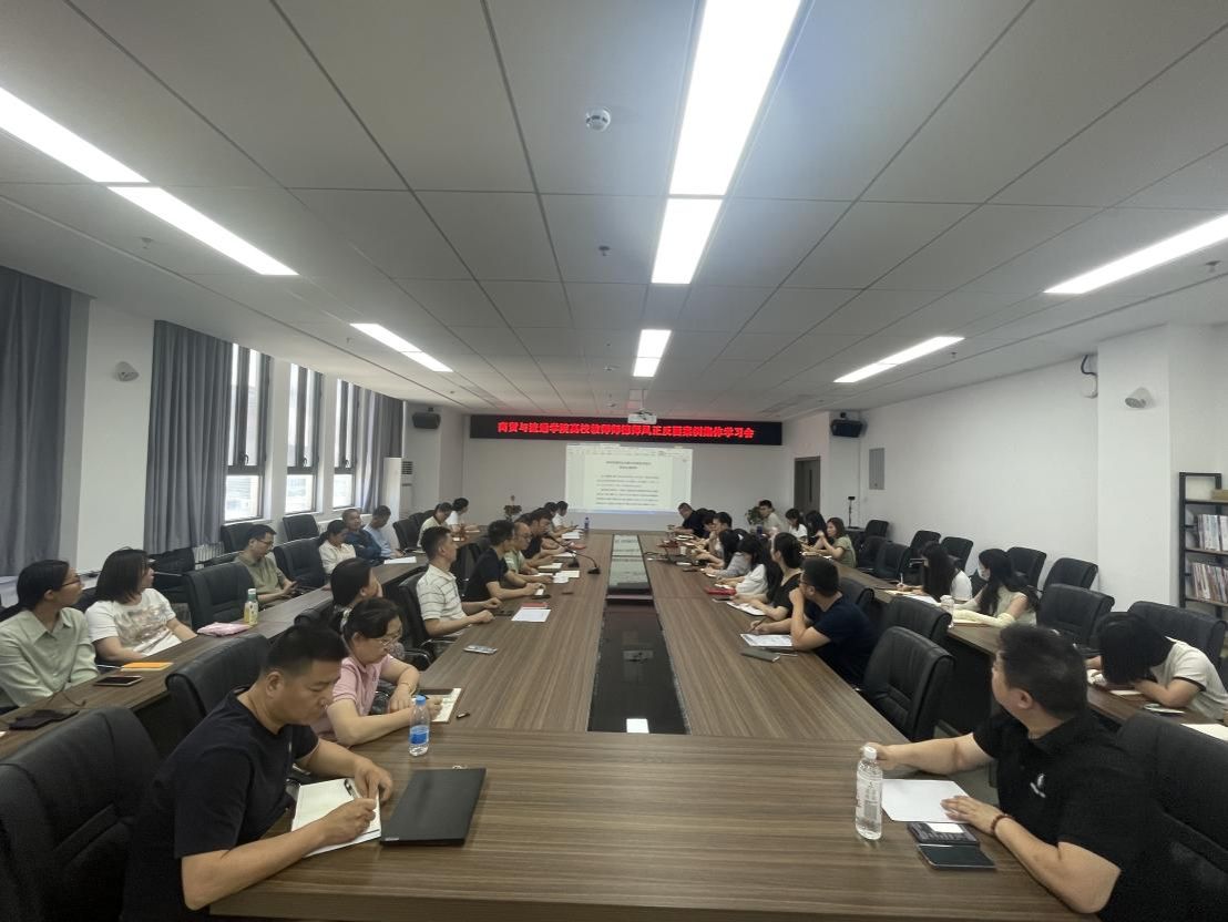 为进一步加强师德师风建设,引导广大教师坚守育人初心、践行育人使命,2025年6月5日,商贸与流通学院通过“学典型、明底线、促提升”的形式,组织全体教职工开展高校教师师德师风正反面案例集体学习活动。学习由党总支副书记蒋鹏同志主持。