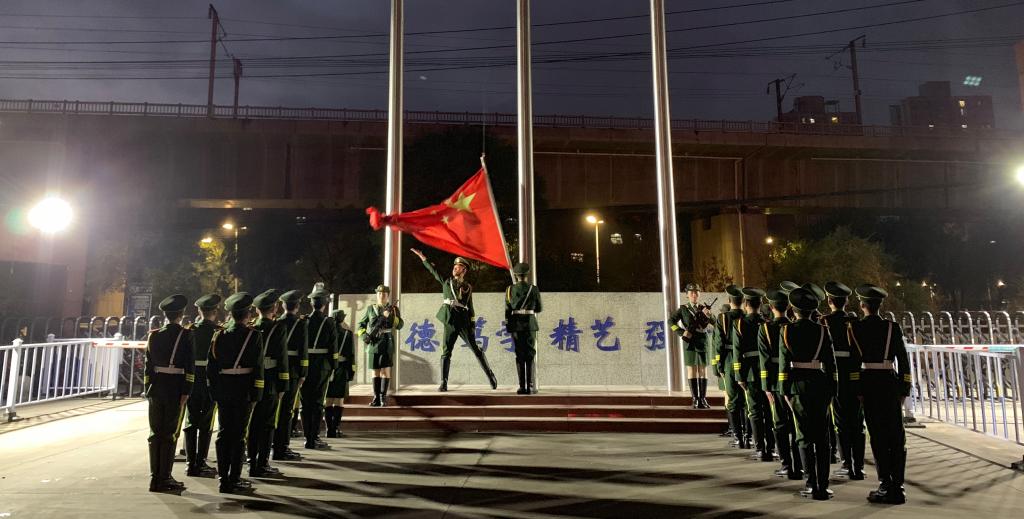7点整,升旗仪式正式开始。在初冬的寒风中,国旗护卫队的队员们迈着坚定而有力的步伐,喊着嘹亮的口号,护送鲜艳的五星红旗走向升旗台。伴随着雄壮的国歌声,五星红旗迎着朝阳冉冉升起,全体师生面向国旗行注目礼。