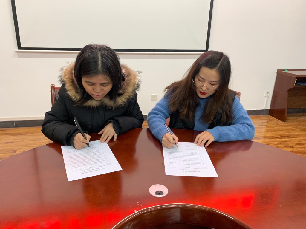 “我志愿成为一名高校辅导员,拥护党的领导,献身教育事业,恪守职业规范,提升专业素养,情系学生成长,做好良师益友。为培养社会主义合格建设者和可靠接班人而努力奋斗!”新进辅导员刘芬芬、岳攀进行了庄严宣誓。宣誓仪式后,新进辅导员刘芬芬、岳攀分别与指导老师冯秋玲、赵俊英共同签署“青年辅导员目标培养考评表”。