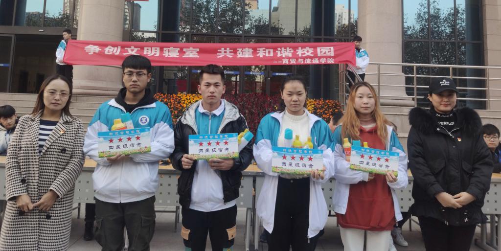 为创造整洁、文明、温馨的宿舍环境,树立文明新风,12月5日下午,商贸与流通学院在精艺楼前举办“争创文明宿舍,共建和谐校园”主题教育活动暨优秀宿舍表彰大会。学工办主任成志平、全体辅导员,以及2018级、2019级各班生活委员、舍长共同参加活动。