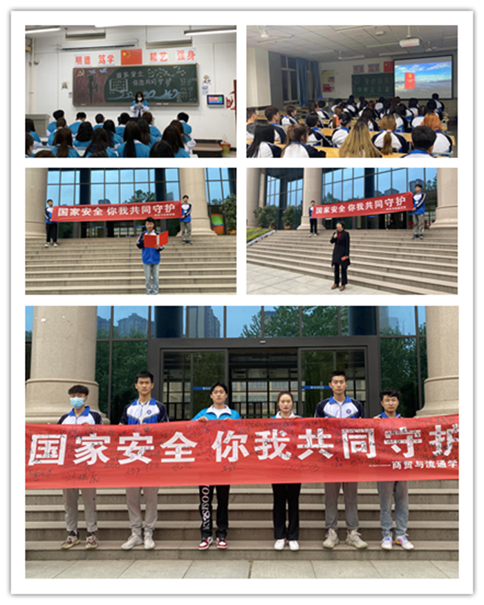 教育活动中,学生代表航物2001班武天一同学代表商贸与流通学院团总支、学生会向全体学生宣读了“以青春之姿,明爱国之志”倡议书,倡议大家做到学习国安知识、增强防范意识,提高政治站位、听党话跟党走,肃清网络风气、抵制信息侵蚀,坚守价值底线、保持清白人生,时刻保持警惕、勇于善为智为,做国家安全的忠实捍卫者。倡议书引发到场学生的共鸣,电商2003班刘洋同学代表现场学生做了发言,他表示,作为新时代大学生,心系国家安全,自觉维护国家安全是我们的职责。我们一定响应团总支、学生会号召,克服妄自菲薄等不正确思想,始终树立国家利益高于一切的理念,以实际行为维护国家安全。接着,党总支副书记王艳同志做了讲话,她通过新型冠状病毒这一生物安全事件造成的社会影响,以及引发的经济安全、舆论安全、政治安全的连锁反应,告诉大家一定要树立总体国家安全观。她告诉同学们,国家安全犹如空气和阳光,受益而不觉,失之则难存。任何时候国家安全都是老百姓最稳当、最可靠的幸福保障。号召大家让行动起来,一起筑起一道国家安全的铜墙铁壁!