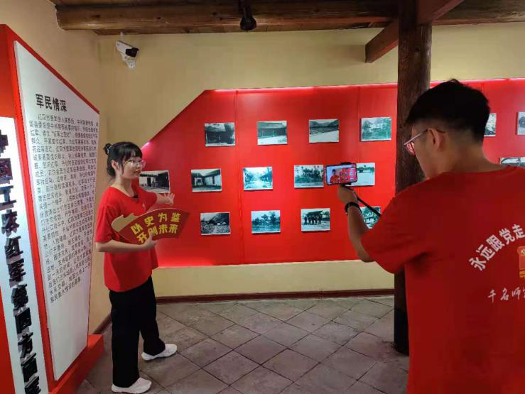 开展特色活动。7月28日,实践团走进中国工农红军第四方面军小河口会议纪念馆。小河口会议是红四军在在生死存亡关头召开的重大转折性会议,是我党善于开展批评与自我批评,积极修正和改善错误的生动实例。在纪念馆学生第一党支部以线上线下相结合的形式举行“学革命史,走强国路”主题党日活动。实践团临时党小组四位党员在展馆内重温了入党誓词。队员郭瑞妮同学以在线直播的形式,带领支部党员参观城固小河口会议纪念馆,支部党员在线交流了学习体会。在小河镇实践团还来到小河敬老院开展志愿活动。  图为当日宣讲成员在小河口会议纪念馆进行线上宣讲活动
