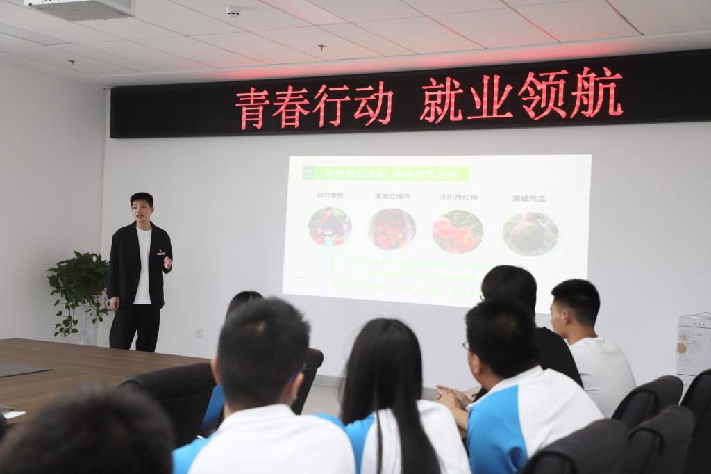5月30日下午5点,商贸与流通学院召开“青春行动,就业领航”主题会议,各班班长和团支书共同参加了此次会议。电子商务专业2102班学生吴煜涵,作为陕西省高校“学习贯彻党的二十大精神”大学生宣讲队成员和《参考消息》数字报校园推广大使,在会上中做了《逐梦乡村振兴,做田间到校园的搬运工》的主题宣讲。