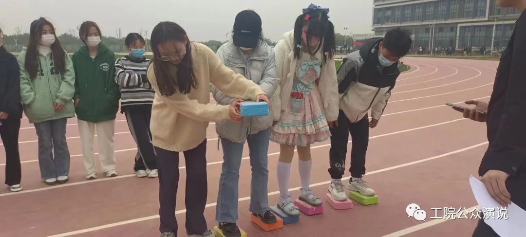 遇河搭桥:四人一组,一共九块彩色砖,站在起点的成员持 三块彩色砖,由第一名队员向前搭放,第四个队员不断地把身后的 彩色砖传给第一个队员,四人踩着彩色砖前进抵达到终点, 要求脚不 能触地,用时最短的队伍获胜。