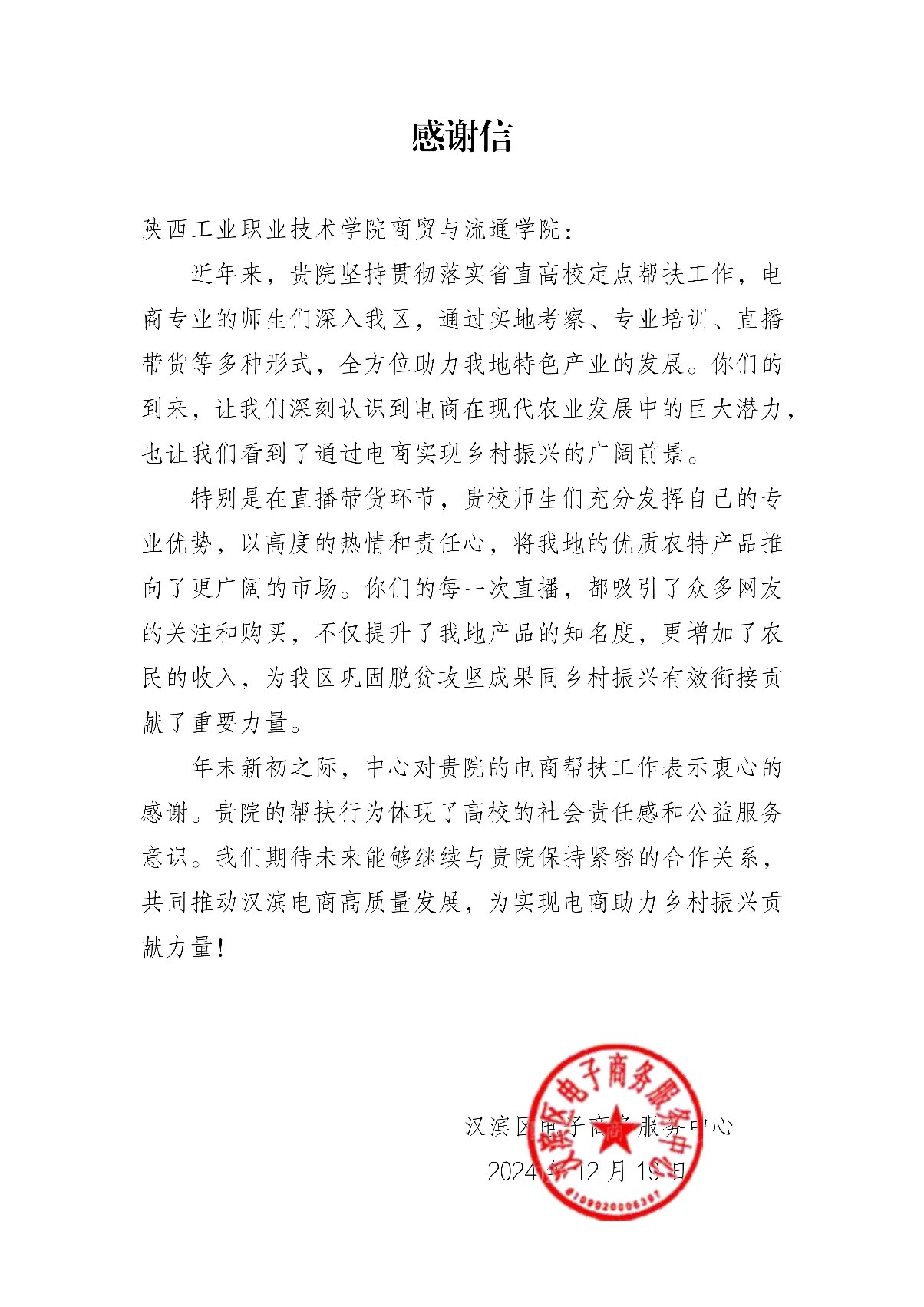 近日,商贸与流通学院收到安康市汉滨区电子商务服务中心发来的感谢信,对学院电商帮扶工作表达诚挚谢意。