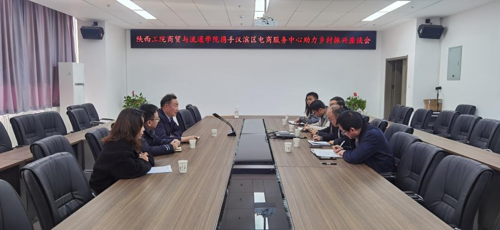 为响应国家乡村振兴战略,做好校地对接,推进助农、扶农项目开展,借力我校电商、物流资源优势,12月21日,安康市汉滨区电商服务中心主任李龙、数字经济部部长张亮一行3人到我校商贸与流通学院开展交流座谈。座谈会由商贸与流通学院党总支副书记蒋鹏主持,我校乡村振兴办公室南欢老师、商贸与流通学院副院长张光、实训中心主任杨涛以及电子商务、现代物流管理等相关专业教师参加会议。
